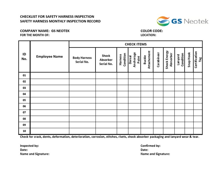 Inspect and document monthly 4. This checklist will help them because. Notify your supervisor and take the : Harness inspection record template before inspecting equipment, workers should be fully knowledgeable in the manufacturer's instructions for proper use, maintenance, and storage. Fall protection equipment inspection log green: